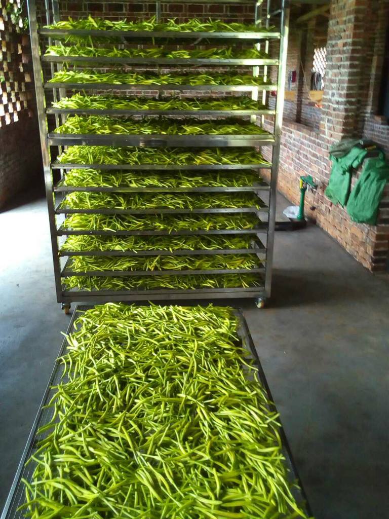 烘干工藝第三步:將高溫蒸煮后的黃花菜均勻鋪放到物料車內(nèi),注意厚度均勻,每層不超過(guò)3CM。
